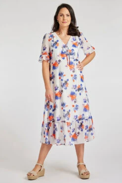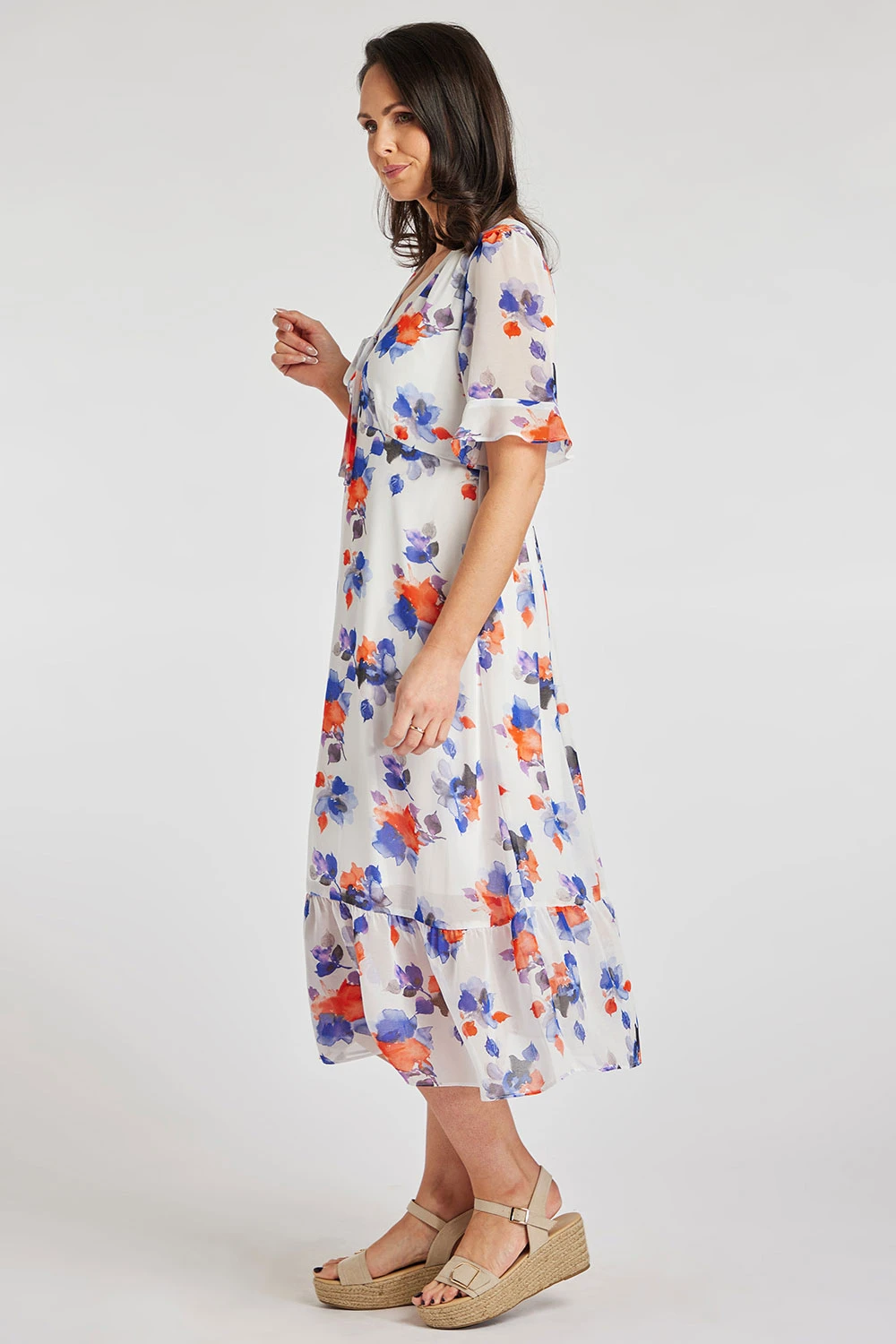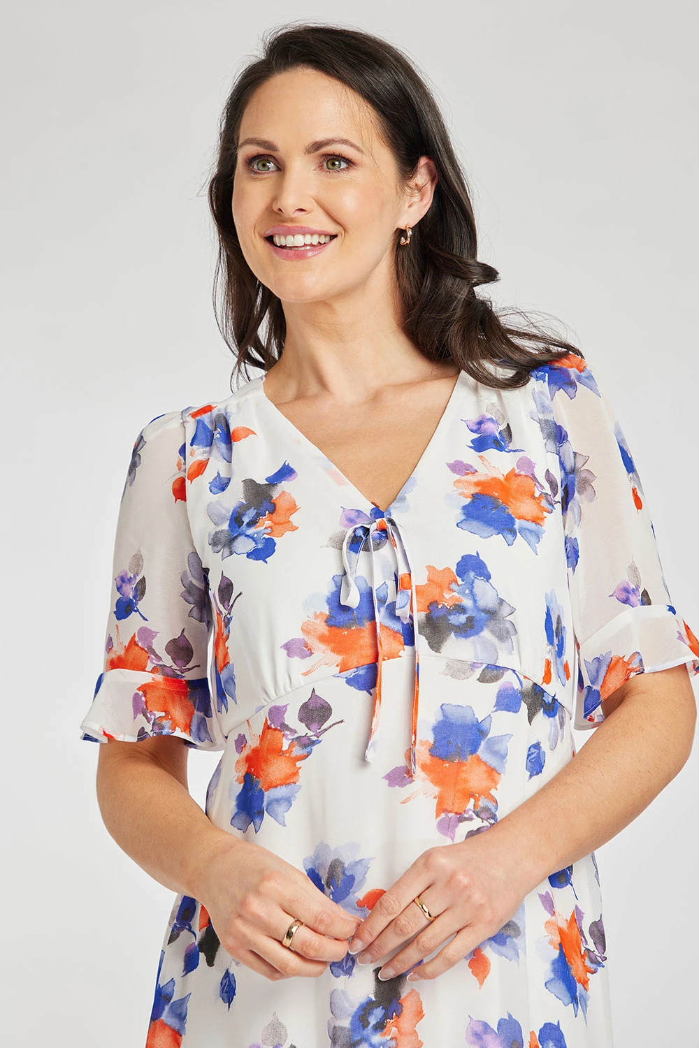 Get ready for Summer with this beautifully designed watercolour floral tea dress. With light material and seasonal design, makes this a great addition to your wardrobe. Pair with strappy sandals and a small bag for a great Summer look.